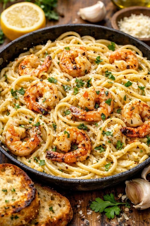 Deze pasta met knoflook, garnalen en champignons combineert diepe aroma’s van goudbruine knoflook, een licht pittige toets van chilipeper en de smaak van zeevruchten met de zachte textuur van champignons. Het is een snel maar elegant gerecht, ideaal voor een doordeweekse maaltijd die toch feestelijk aanvoelt.